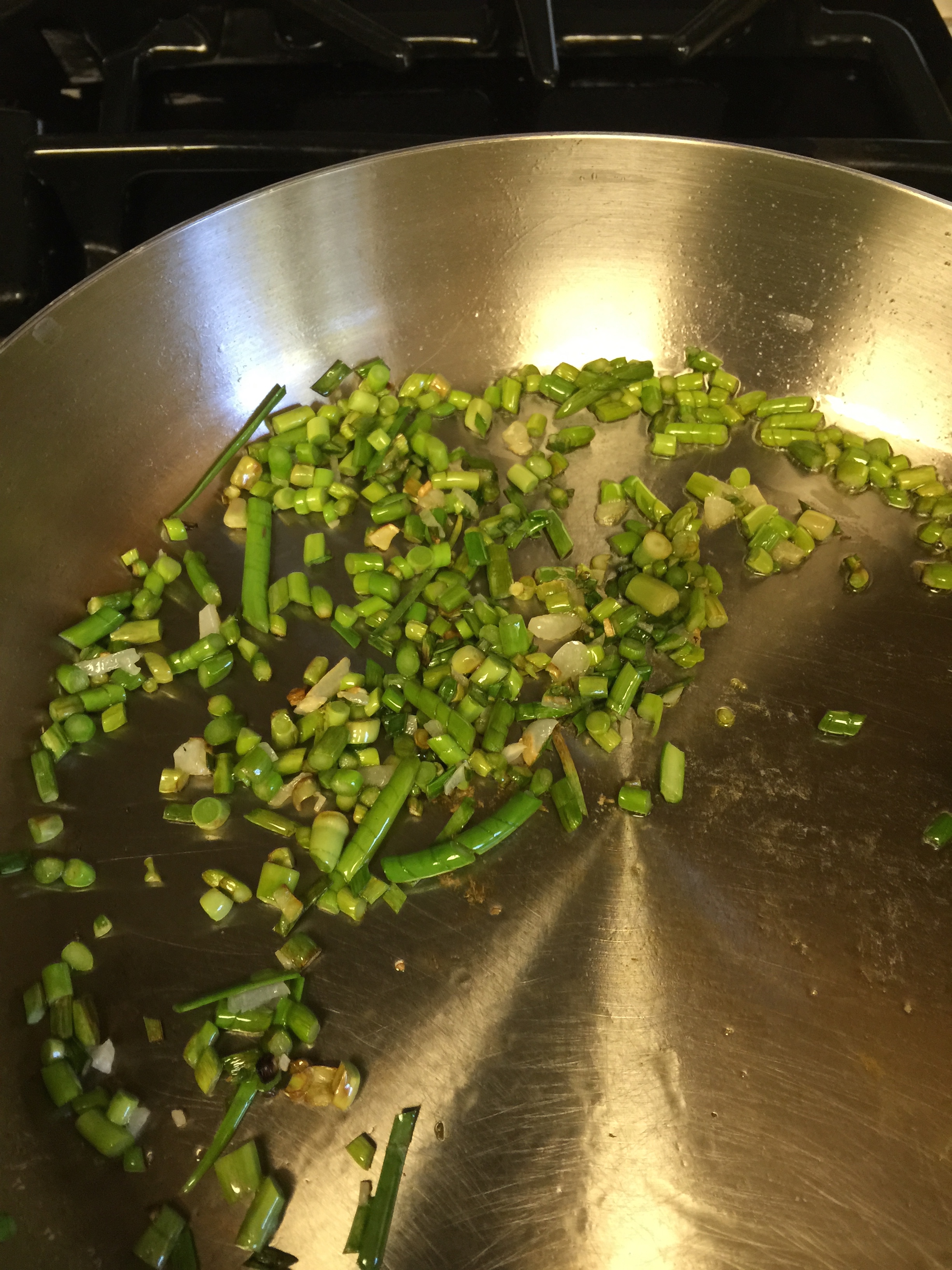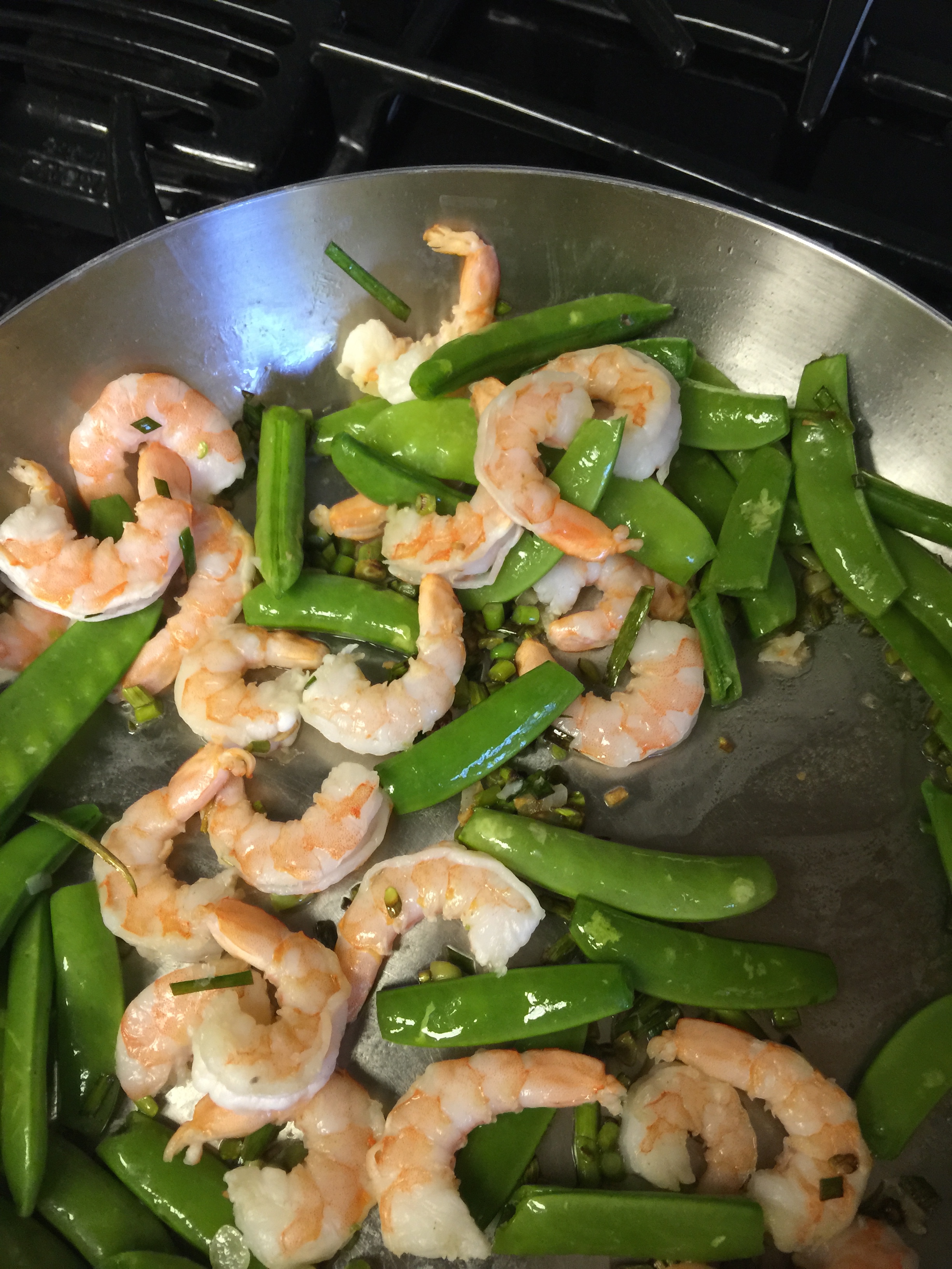 In a large skillet heat 1 T olive oil over medium-low heat.  Add 5-10 thinly sliced garlic scapes and cook for 5 minutes, stirring occasionally, until tender.  Add 1/2 to 1 pound large peeled and deveined shrimp, 1/2 pound snow or snap peas (or both), 1/2 t salt, zest from 1 lemon and cook for 5 more minutes or until cooked through, but not overcooked.  You do want peas to be bright green and still somewhat crisp.  Remove from heat and stir in 2-3 T fresh lemon juice, 2 T chopped parsley and 2 T unsalted butter.  Swirl until creamy and butter is melted.  Enjoy!