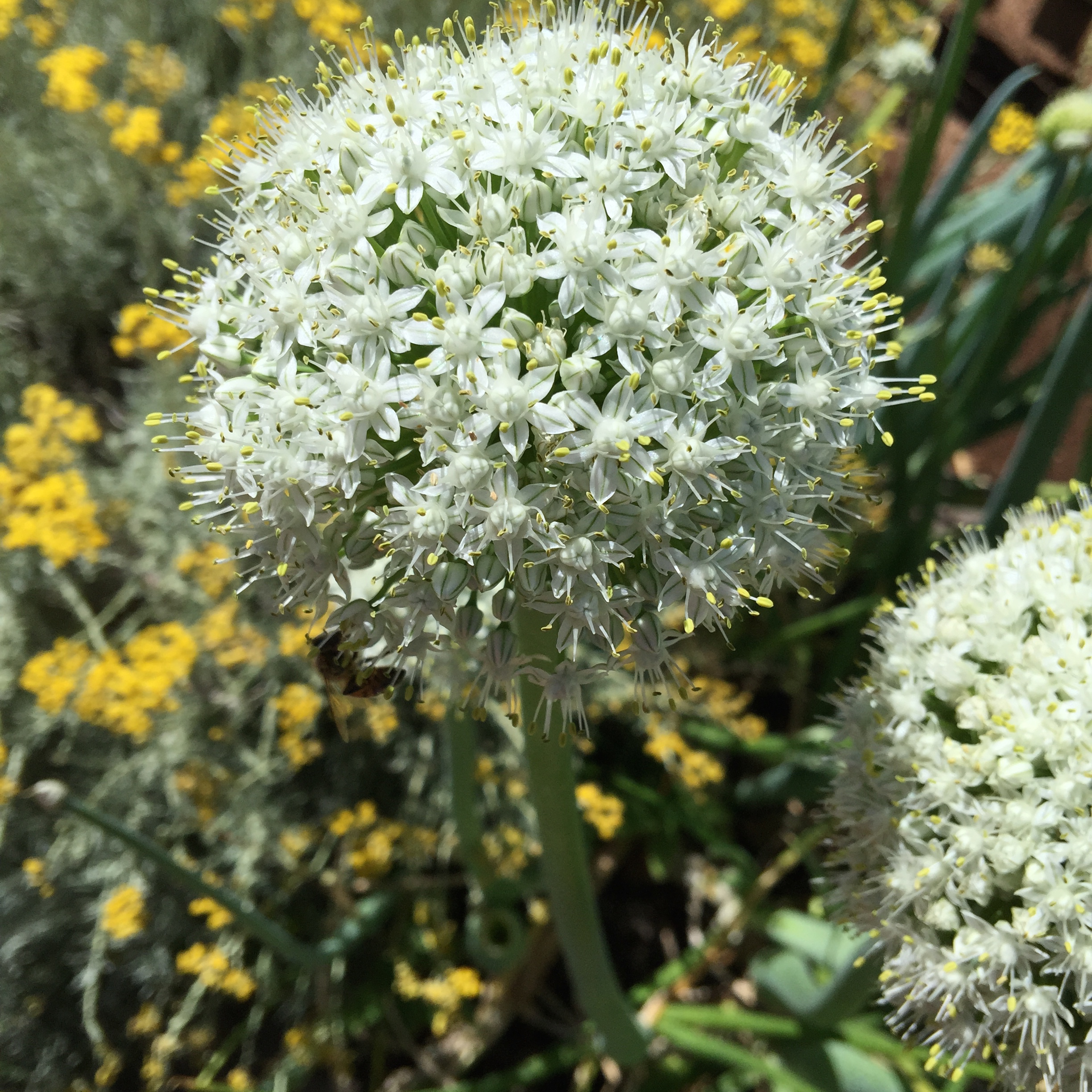 Look for the pretty! The onion scape is not only pretty, but very flavorful in salads, pastas or as a finishing touch for roasted veggies. Just cut the flower tops off and sprinkle away.