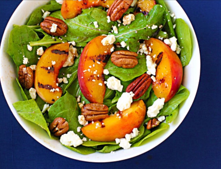 Prepare a grill for direct-heat cooking over medium-high heat ( or use a stove top grill pan) oil the grill grates to prevent sticking.                                                   In a small bowl, combine the honey, a pinch of salt and 1 tsp pepper. Brush the peach halves with olive oil and place on grill, cut side down. Cover the grill and cook until the peaches just begin to soften, 3-4 minutes. Turn the peaches and brush with honey mixture. Cook until tender but not falling apart, 2-3 minutes longer. (Serve either cooled or hot off the grill) on a bed of Arugala, sprinkle with feta cheese. And enjoy