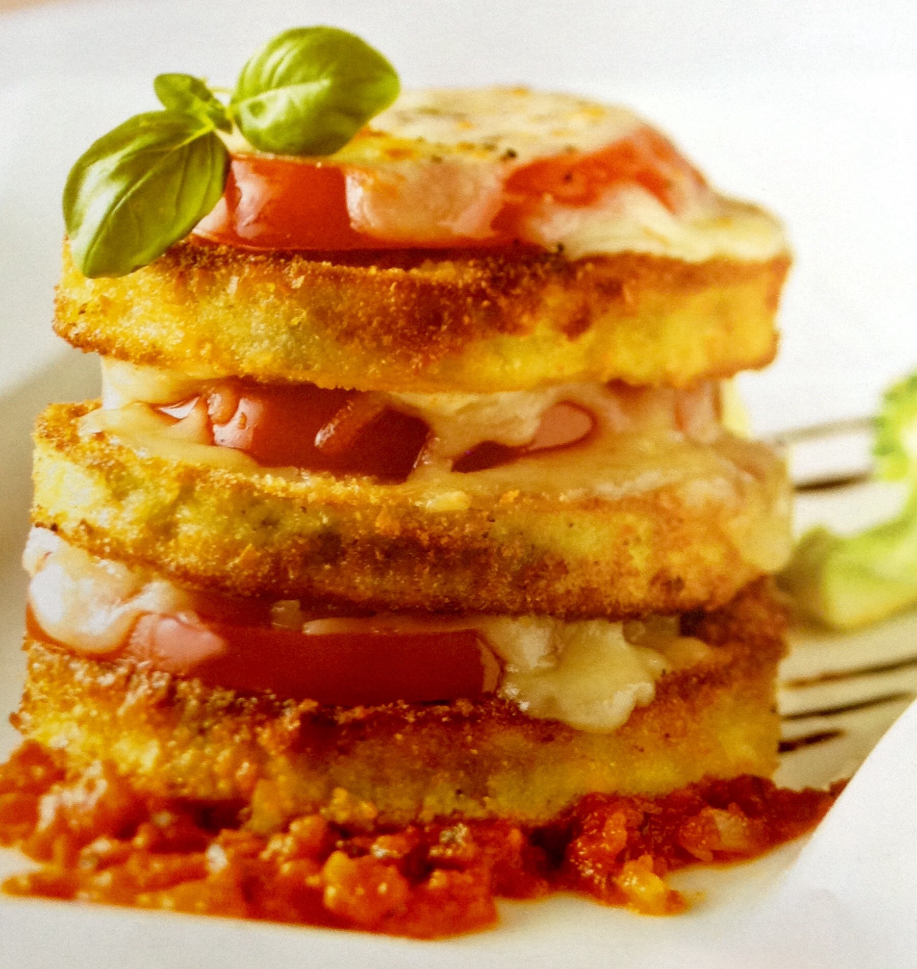 To serve, stack three eggplant/tomato slices on each plate. garnish with basil. spoon marinara around eggplant tower and drizzle with balsamic reduction.