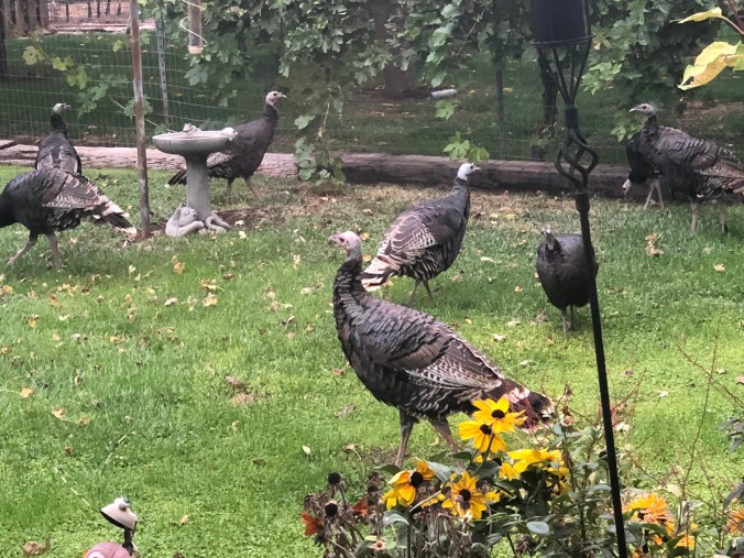 It’s been a fun week with our new morning visitors. Turkeys! There are 13 that come into the orchard and hang out for 30 minutes or so.